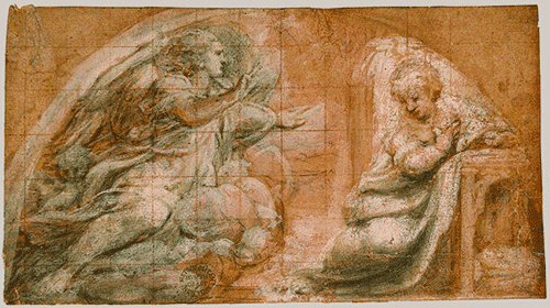 Correggio; The Annunciation; ca. 1522–25; pen and black ink, brush and gray wash, highlighted extensively with white gouache squared in red chalk, on pink-washed paper; "Correggio (Antonio Allegri) (Italian): The Annunciation" (19.76.9) In Heilbrunn Timeline of Art History . New York: The Metropolitan Museum of Art, 2000–.http://www.metmuseum.org/toah/works-of-art/19.76.9. (November 2013)