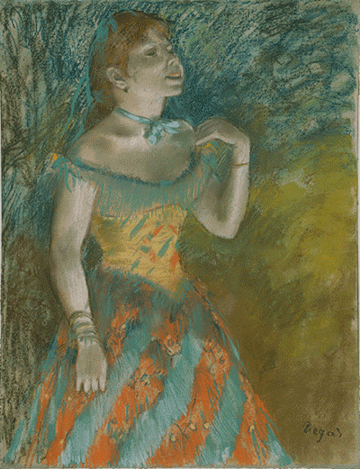 Edgar Degas; The Singer in Green; 1884; pastel on light blue laid paper; "Edgar Degas: The Singer in Green" (61.101.7) In Heilbrunn Timeline of Art History . New York: The Metropolitan Museum of Art, 2000–. http://www.metmuseum.org/toah/works-of-art/61.101.7. (December 2008)